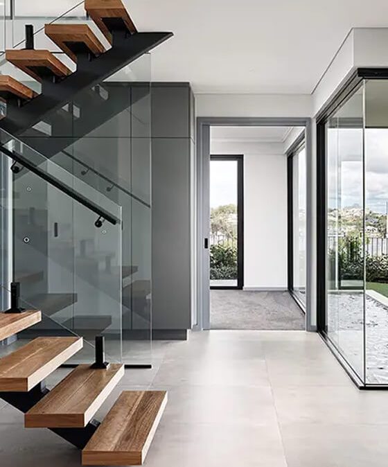Eight metres of glass meet a waterfall window in our Mount Pleasant build creating a design you won’t forget, drawing the eye upward and inspiring every step through the home.